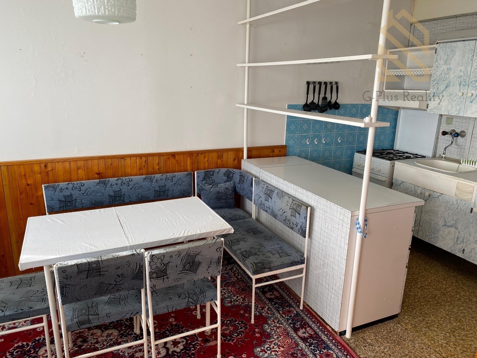 Byt je plně vybaven – k dispozici je postel, skříň, jídelní stůl se židlemi, lednice a další základní vybavení.
